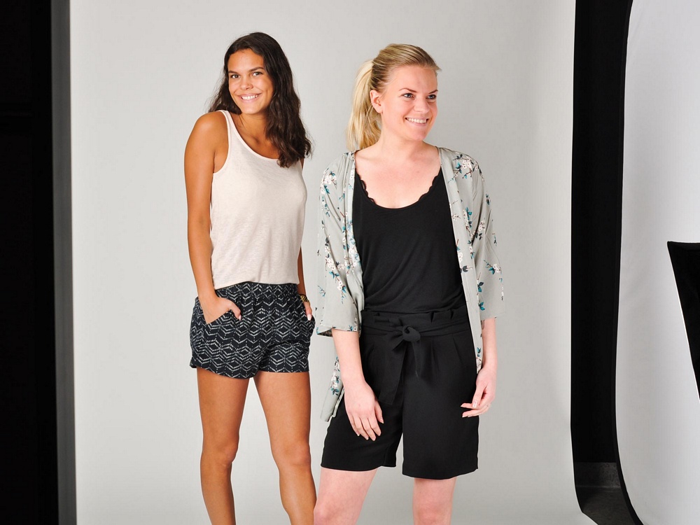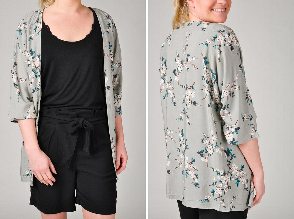 Jessica har på sig kimonon från omtyckta Tristiane-serien. Den kommer ni kunna matcha snyggt med de andra plaggen från serien. De svarta shortsen med knytet kommer från Pieces och sitter så skönt på!