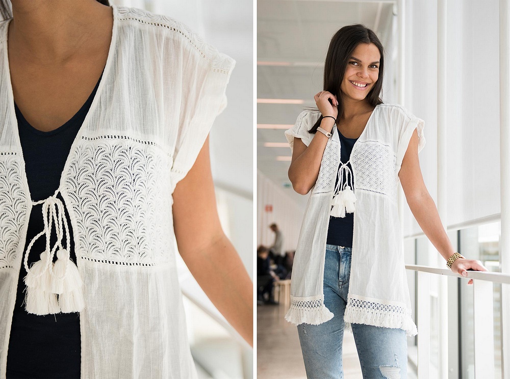 Jessica har på sig byxorna "Onlkendell" i vitt. Till dem har hon toppen "Vilacie S/S Top". Den har superfina detaljer längst med axeln. Över axlarna har hon på sig dagens tröja som kommer i fyra härliga färger!