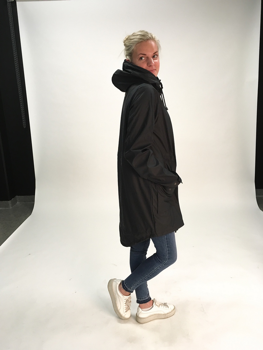 På översta bilderna har jag den mörkblå-svarta regnkappan