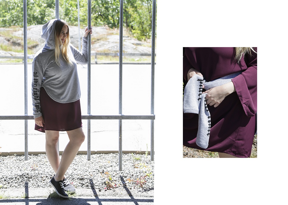Idag kommer det upp en supersnygg klänning som Josefin har på sig här ovan. Kommer även i mörkblått och har så fin skärning och fin öppen rygg. Över klänningen så har hon dagens college-tröja med texten "At the right time, in the right place" som löper ut på ärmarna och detta blir en sån cool combo att ha ihop när man mixar en söt klänning med lite coolare bas-tröja!