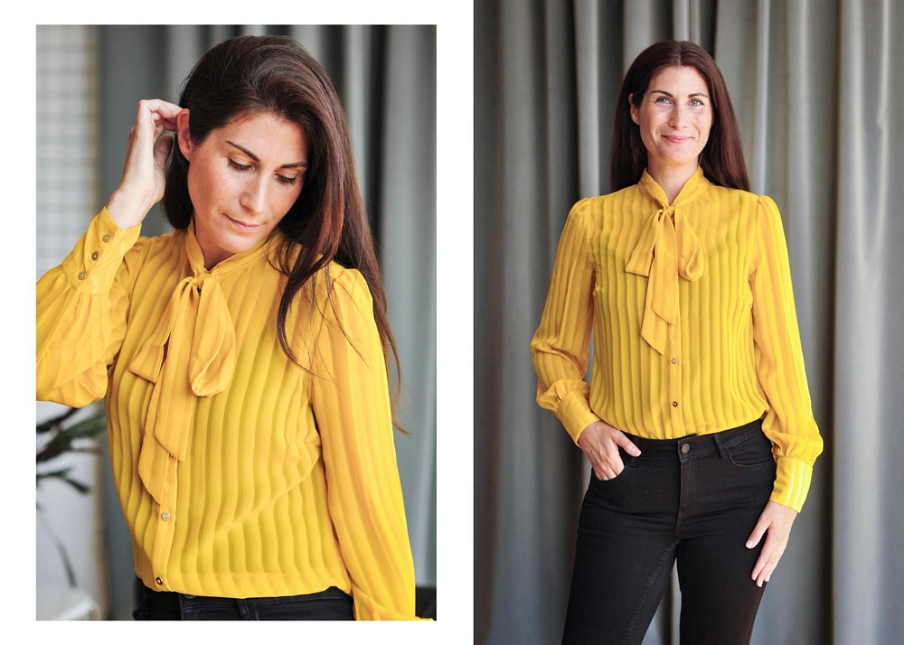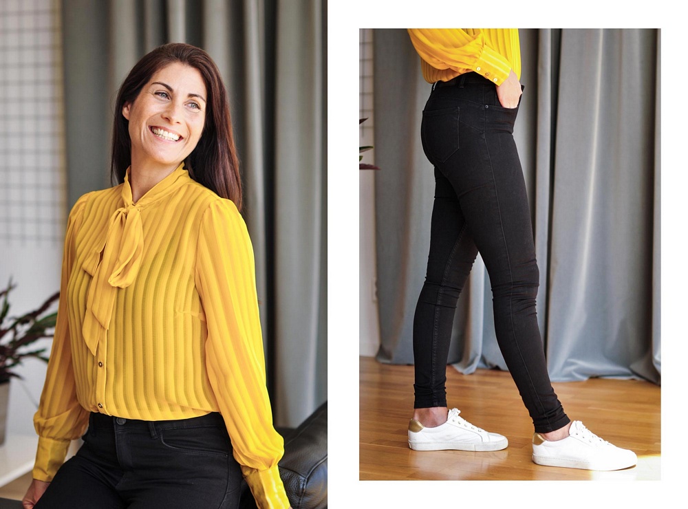 Lina har på sig den helt otroligt snygga blusen som kommer i tre olika färger. Senapsgul som synes ovan, blå och vit. Till den har hon nya jeansen i shape-up modell och som sitter som en smäck.