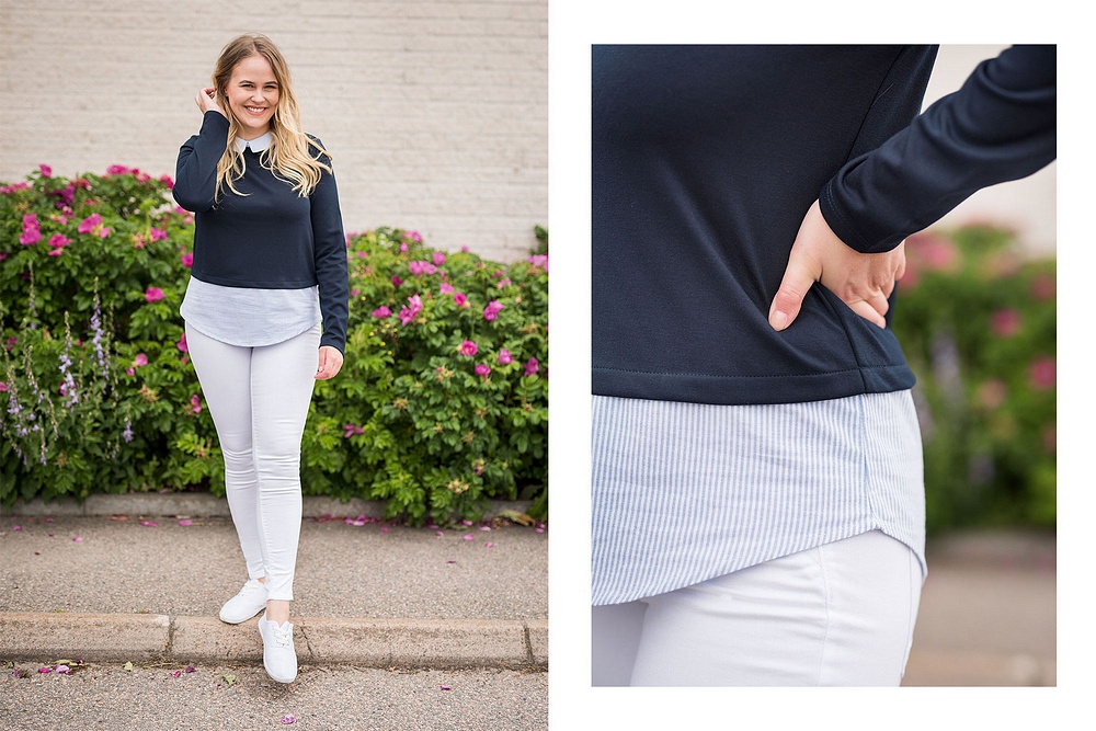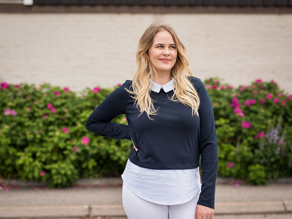 Josefin ser ni här ovan i dagens snyggaste skjort-tröja som sitter ihop och som gör det lätt att alltid vara dressat snygg vart du än skall.