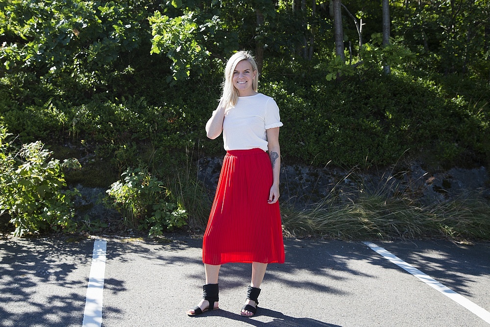 Här ovan ser ni Jessica i dagens plisserade och helt underbara kjol som är i perfekt längd och kommer i färgen till synes, olivgrön och i mörkblå. Till det har hon söta toppen från object med små volanger i ärmslutet.