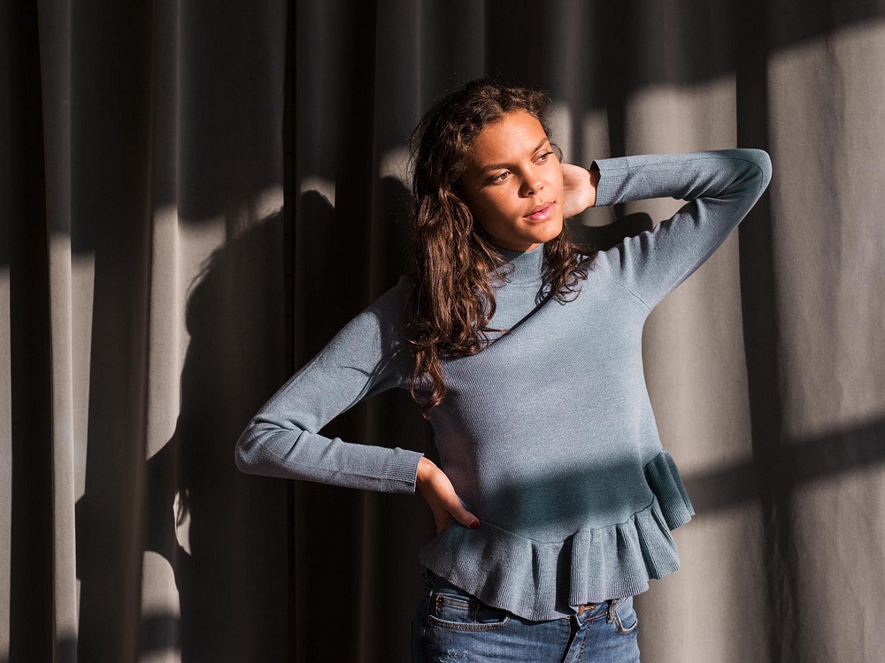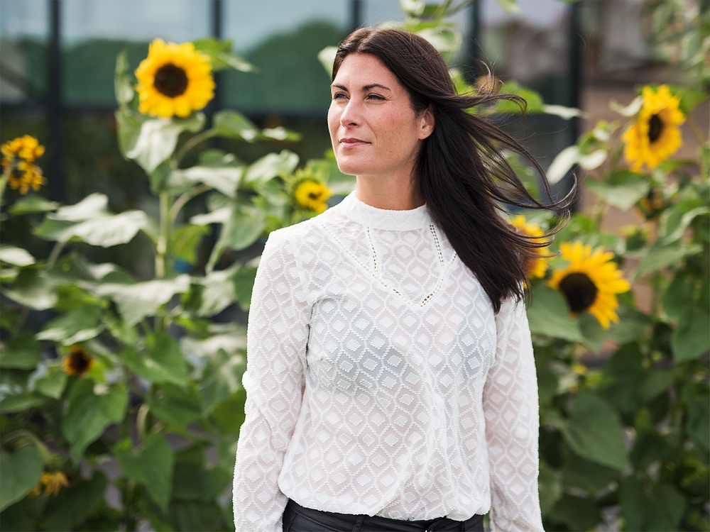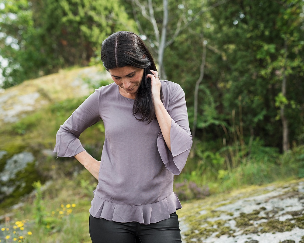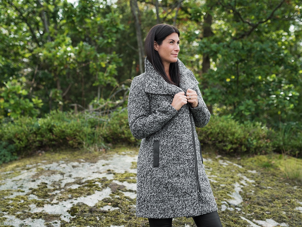 Här visar Lina upp dagens kappa som värmer gott till höst och vinter! Blusen kommer i tre färger och är från Soya. Så fin effekt med volangdetaljerna.