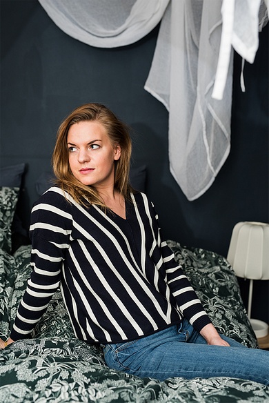 Här ser ni Jessica i "ONLAYA 7/8 V-NECK PULLOVER". Effekten blir riktigt fin när det randiga följer V-ringningen! Det ger en feminin och elegant look. Vi tycker att den passar jättefint ihop med ett par blå jeans för att få en vårig look! Välj gärna en ljusare tvätt för att få lite ljus i outfiten. Tips på jeans är dessa: "VICOMMIT RW 7/8 5P STRAIGHT JEANS". Vi älskar både färgen och modellen.