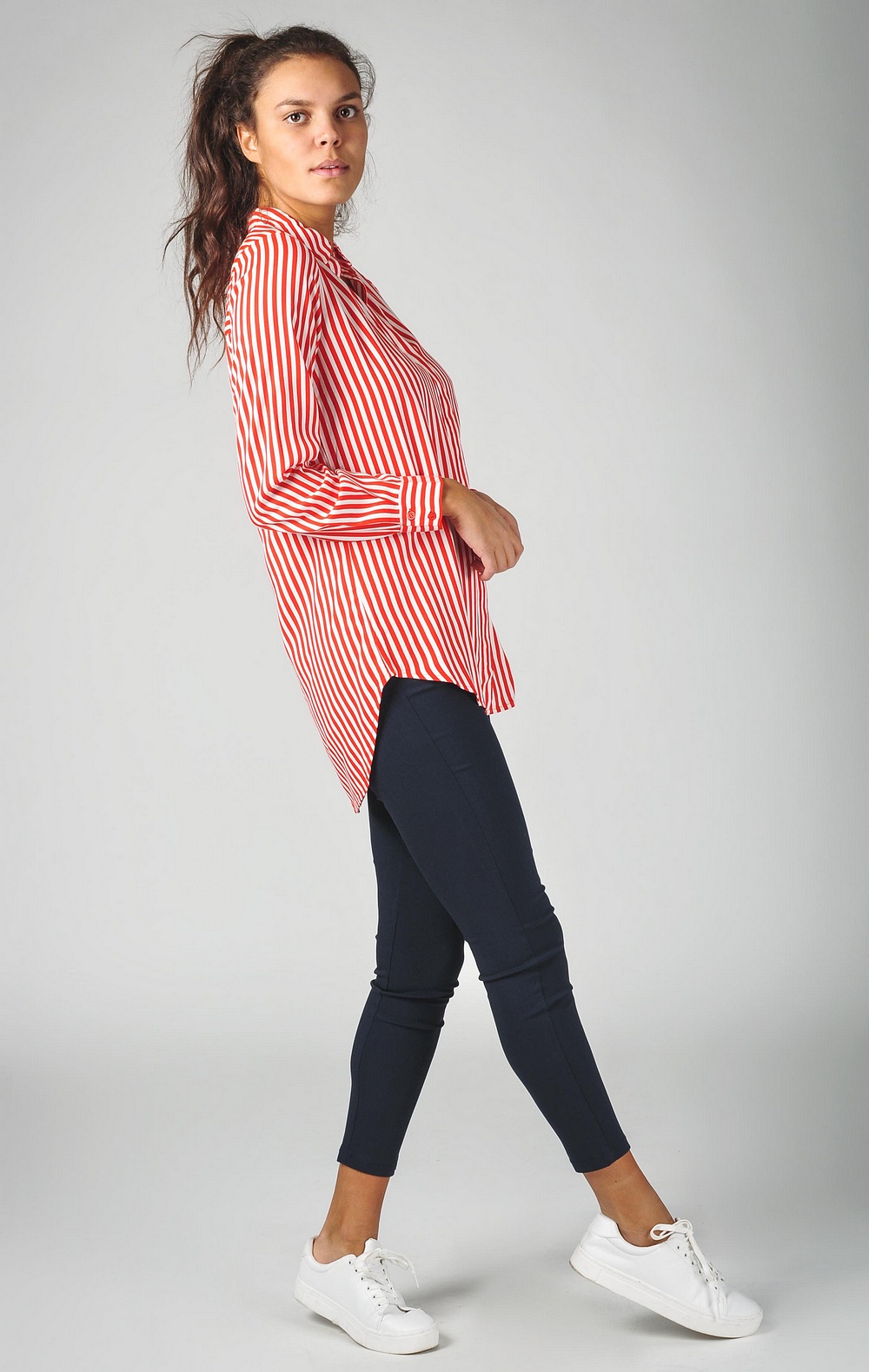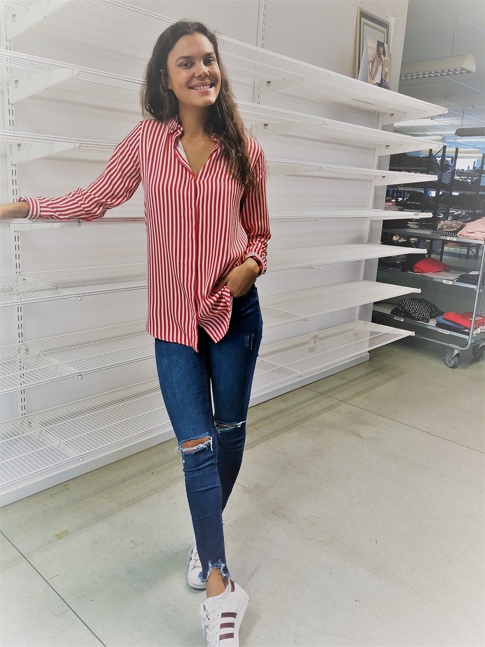 Amanda inspirerar oss med en riktigt fräsch outfit i marint tema. Ränder fortsätter trilla in till oss på Mandel och det är så kul att se att ni tycker om det också! Den här skjortan i en längre modell är så fin i sitt fall. Amanda och Ellika funderar på att norpa varsin. Den kommer även i blå/randigt.