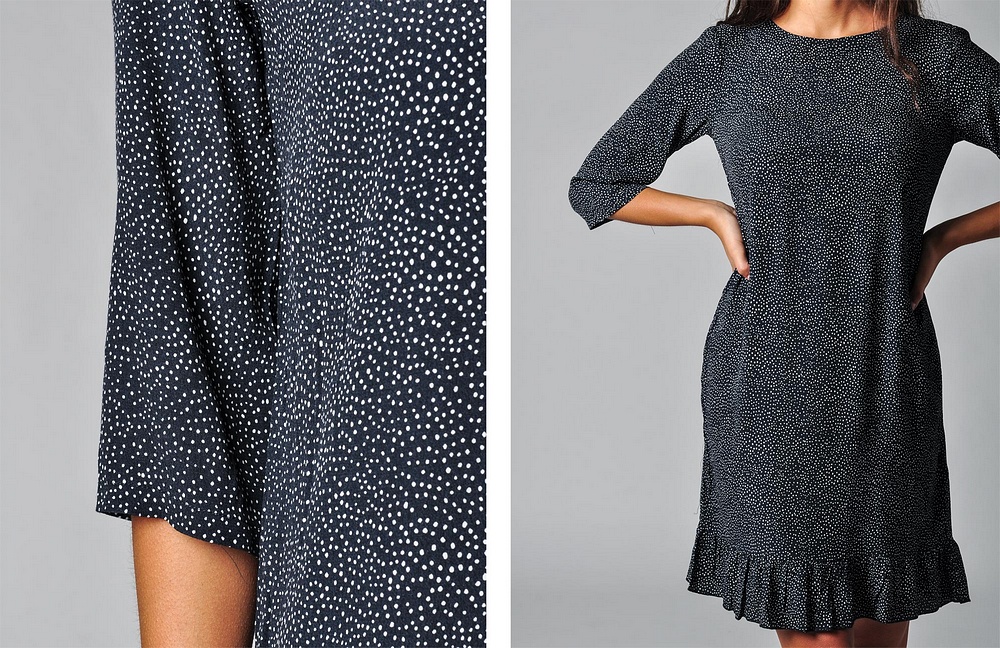 Vi får en omlottklänning från Soya i fint mönster.