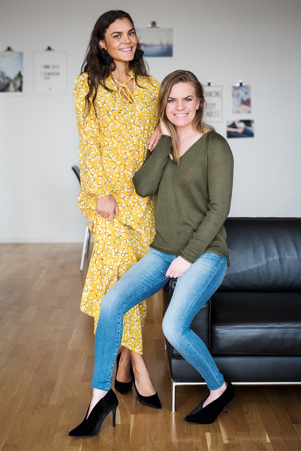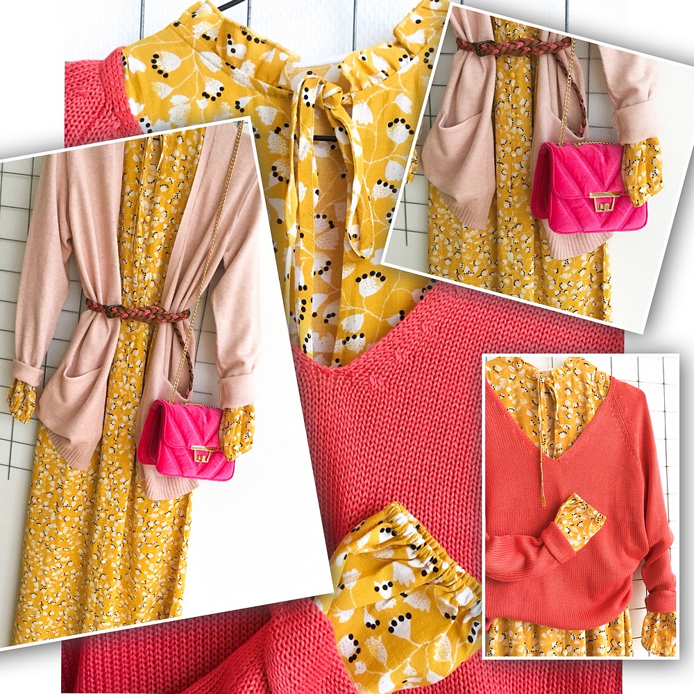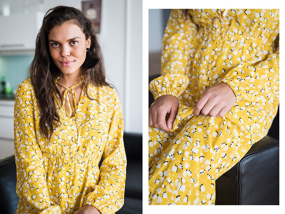 Den här gula färgen och printet på klänningen är verkligen så fint och perfekt till våren och sommaren! Snygg att matcha med dagens v-ringade pullover VITOBINA som blir en snygg färgstark outfit.