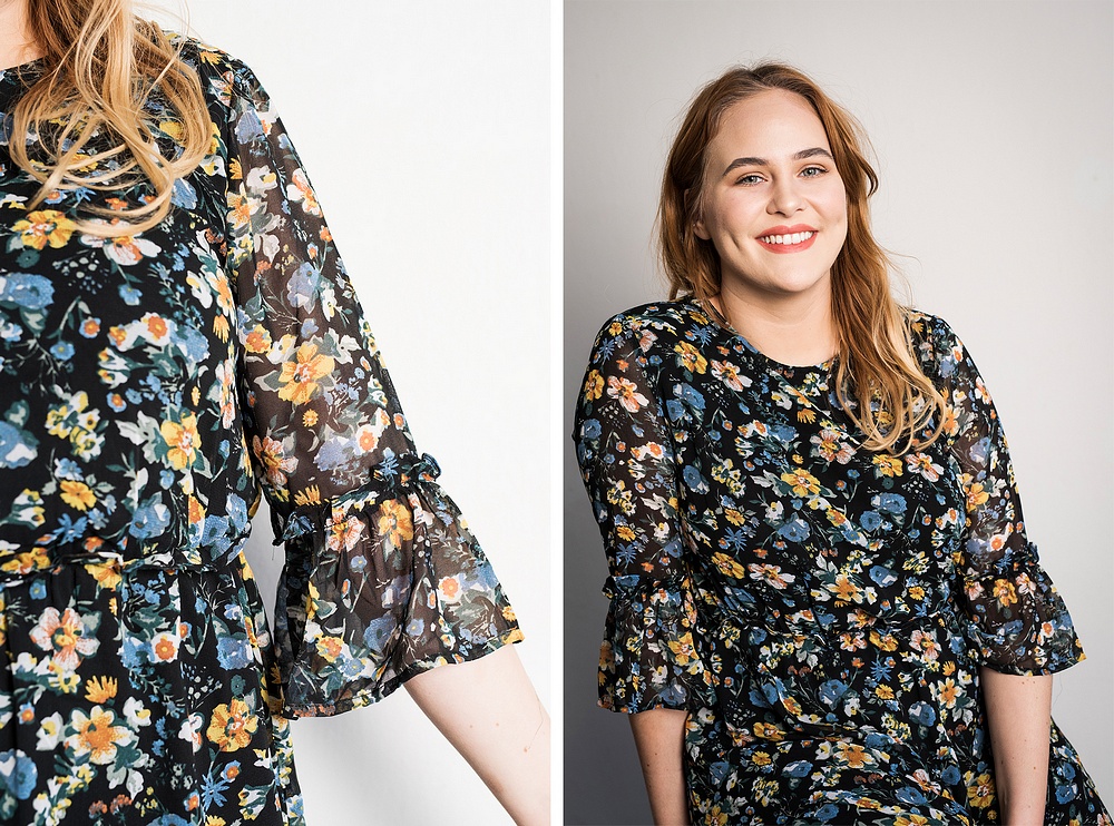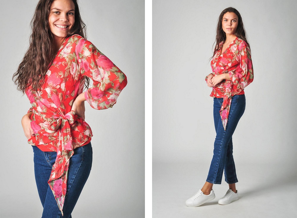 Amandas fantastiska blus har vi även som klänning! Man blir så glad bara av att titta på den. Det är omlottmodell med ett underlinne.