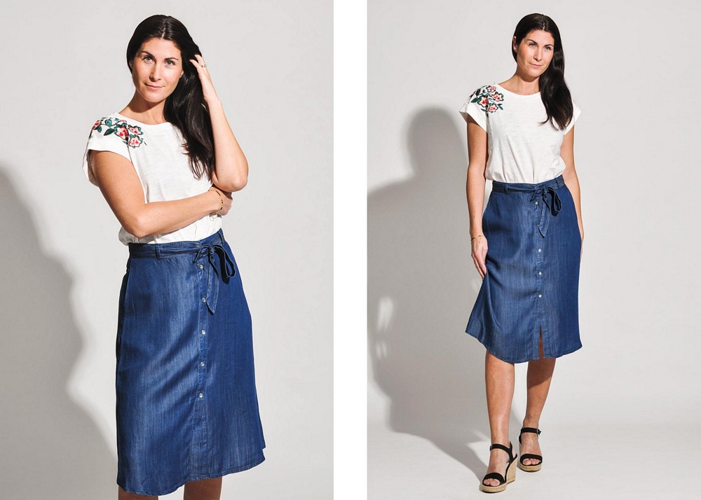 Vi får en jättefin jeanskjol som sitter riktigt bra på.