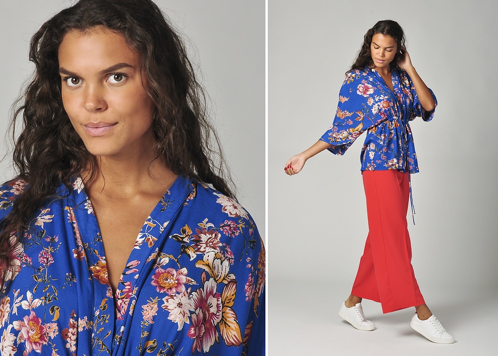 Amanda har på sig fräscha röda nya byxorna i vid modell och supersöta blå omlott-toppen som är lite glansig i tyget och känns så lyxig och skön på!