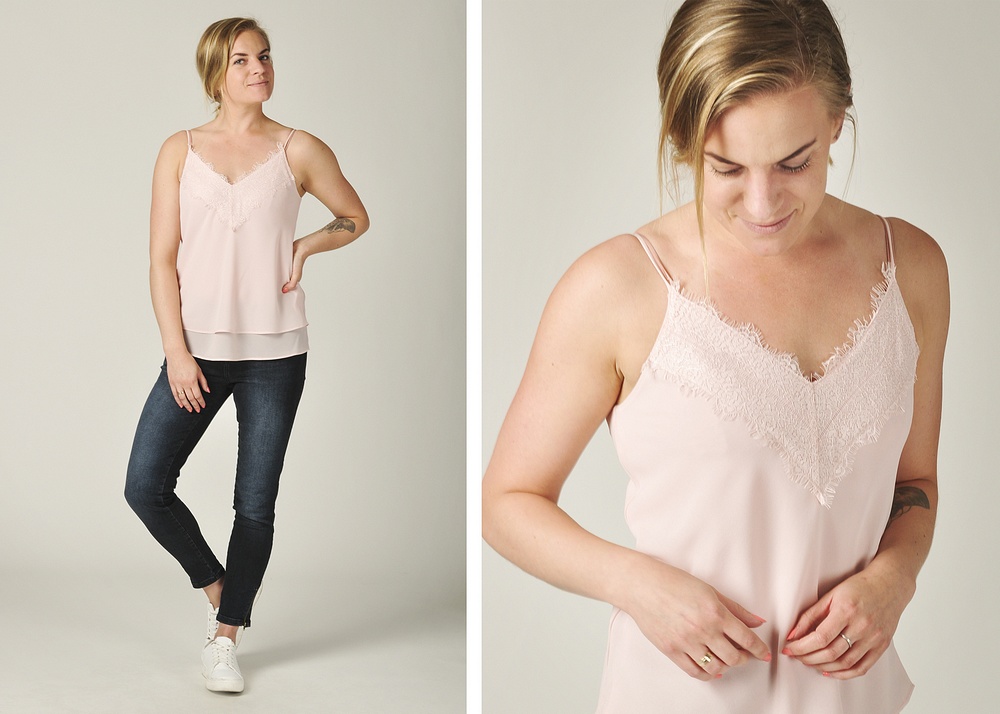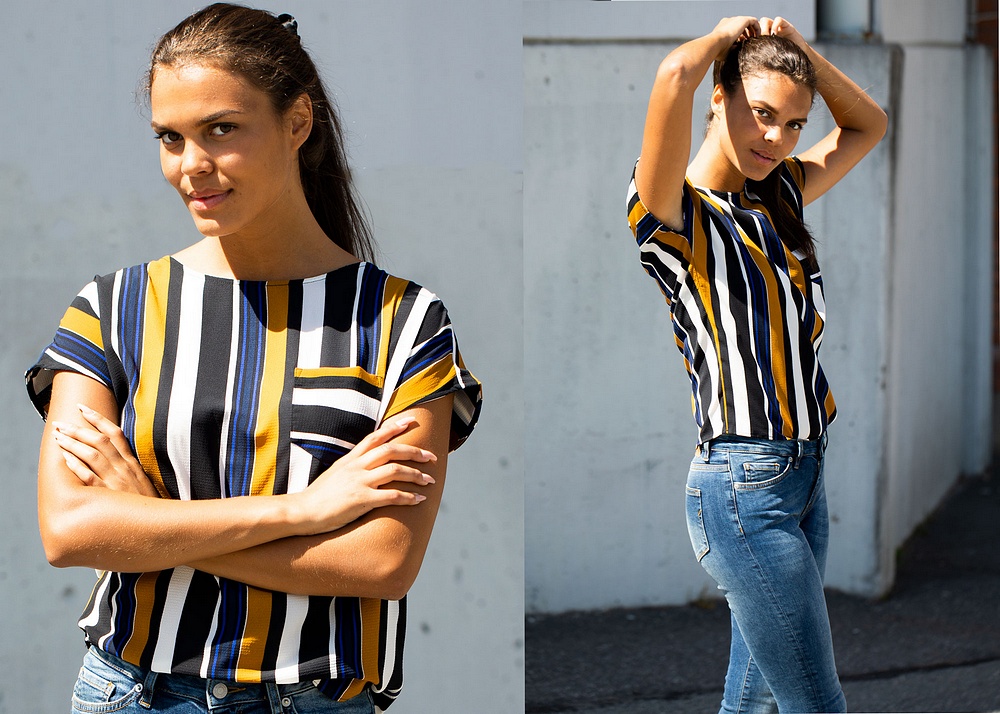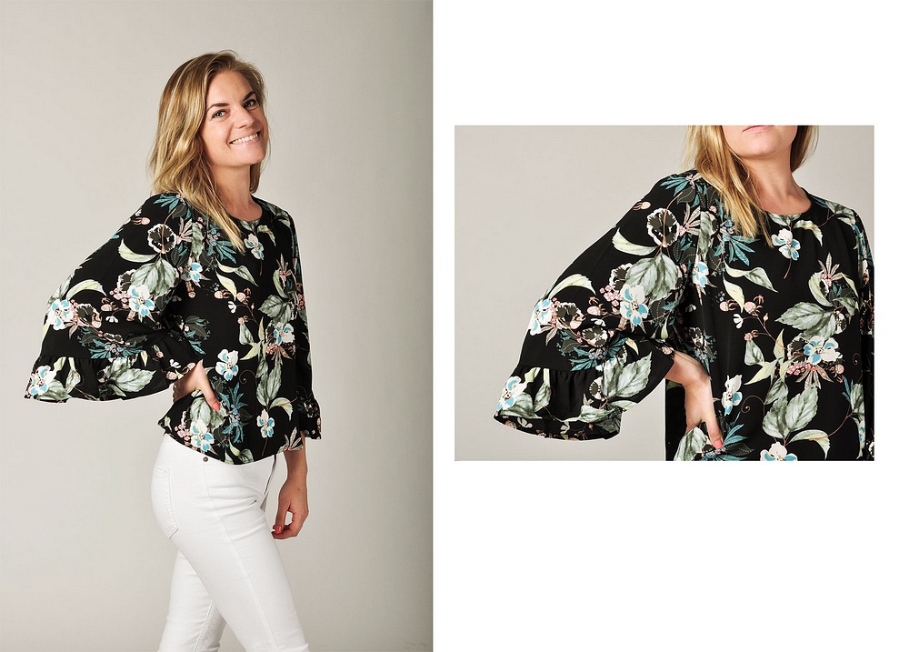 Jessica har på sig en topp från Onlys Lux-serie. Den kommer även i det populära printet "Blue Depths/ Mandala.