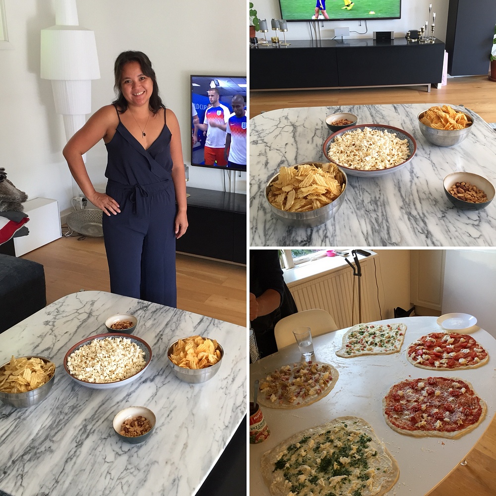 Nu har vi laddat upp här hemma med snacks och dryck inför kvartsfinalen! Vi är några familjer här hemma som ska ses och heja på Sverige.Det skall bli så spännande. Igår var vi hembjudna till våra vänner på en aw där det lagades hemmagjorda pizzor. Sååå gott Tyvärr han jag inte ta en bild när de var klara, men det var väldigt mumsiga.