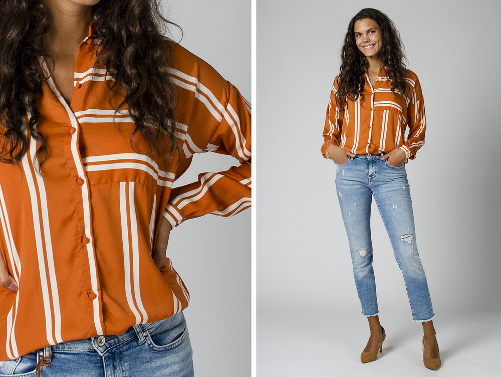 Den här skjortan i randigt är riktigt snygg. Det lite glansiga materialet och färgen blir så snyggt. Den kommer vara perfekt att ha till vardags för att sen traska vidare till aw! Den är lite längre i modellen och kommer även i grönt.