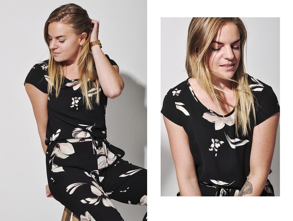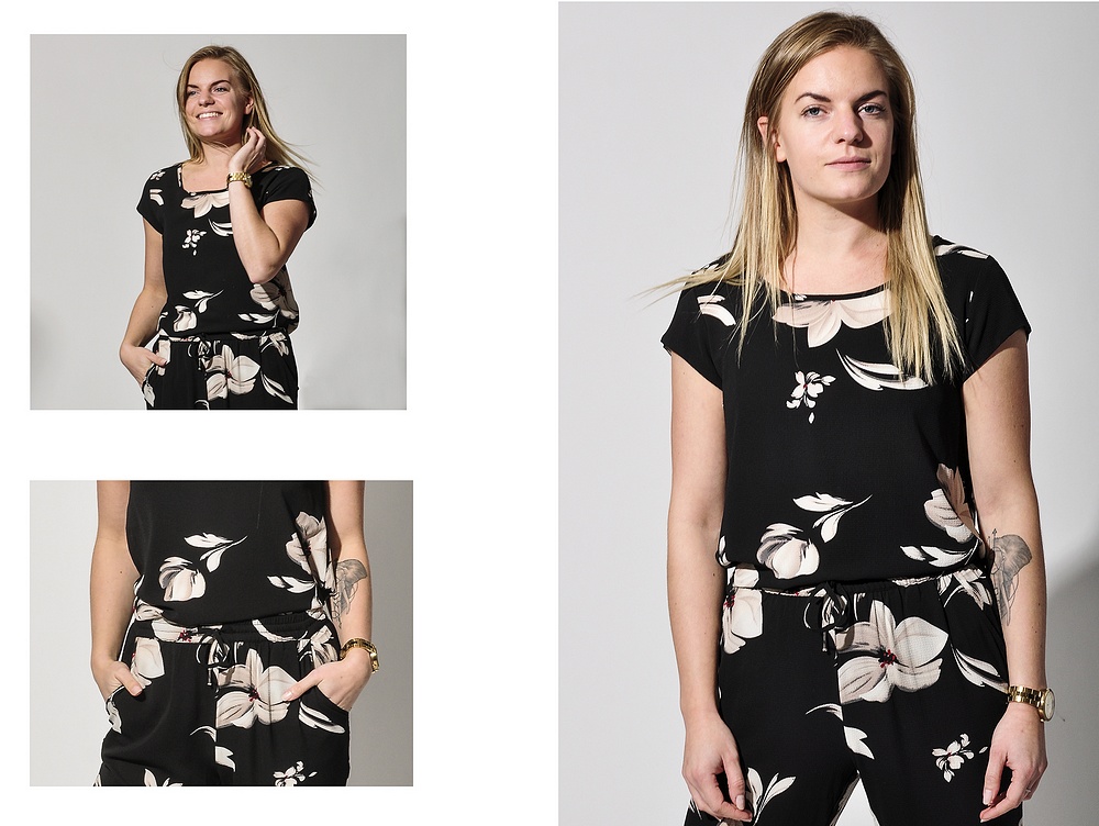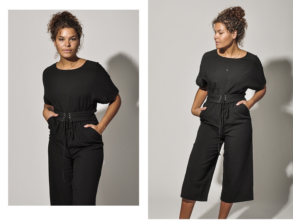 Kajsa har på sig superfina jumpsuiten som kommer idag. Den här har lite grövre material och är i fin culottemodell med fina detaljer, bland annat ett snörat korsett-skärp.