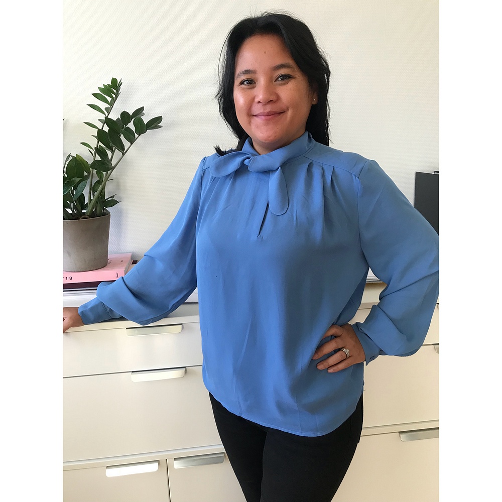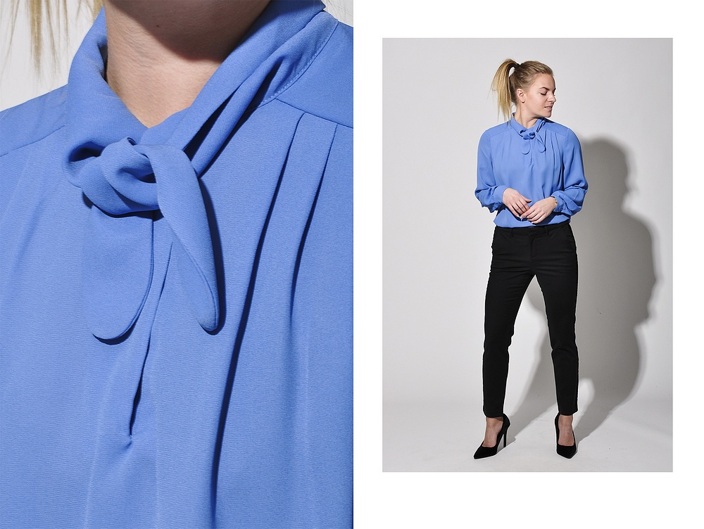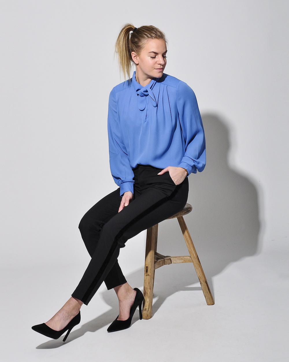 Jessica har på sig Selected Femmes blus med knytning vid halsen. Så fin himmelsblå färg som gör sig riktigt snygg ihop med svart!