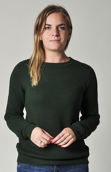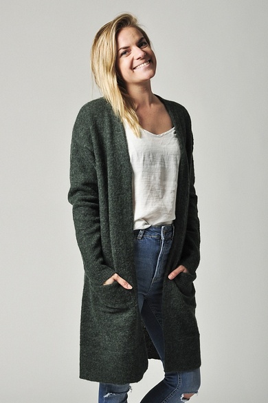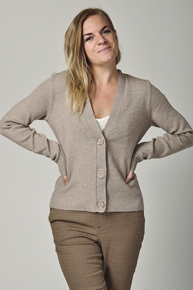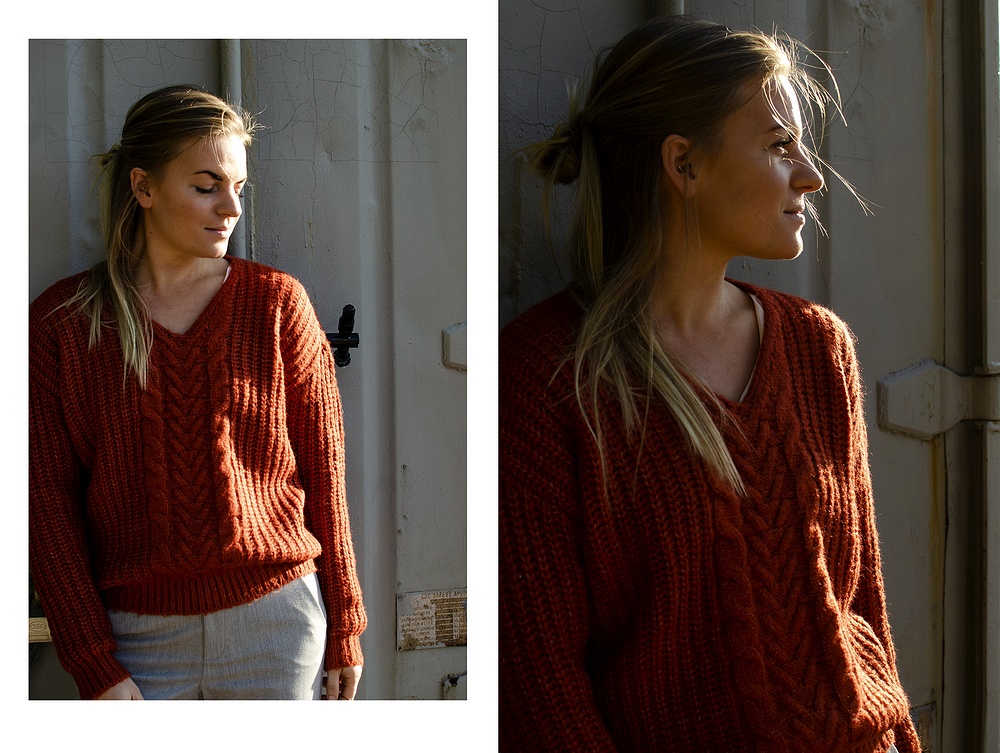 Jessica har på sig dagens stickade tröja i läcker färg. Hon har matchat med Vilucy under för en dressad look.