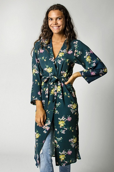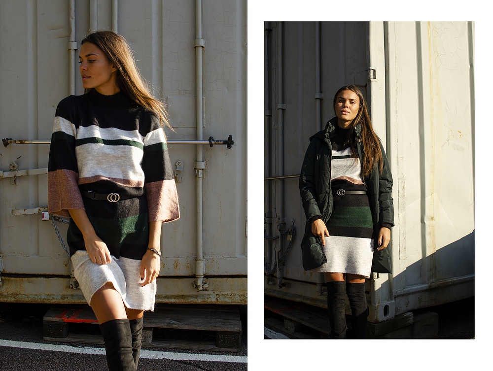 Till klänningen har hon dagens dunjacka från Only. Den gröna jackan fångar snyggt upp färgerna i klänningen!