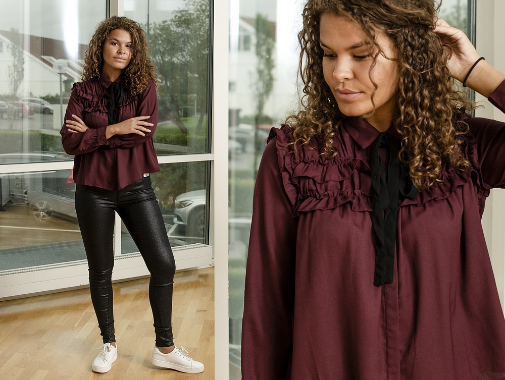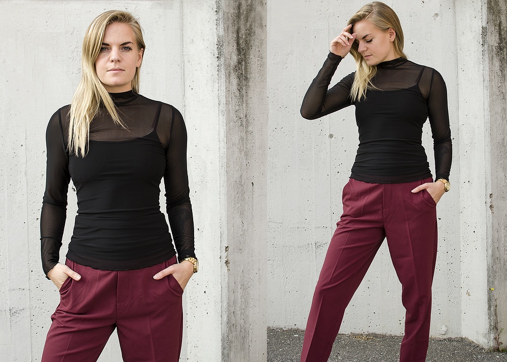 Ni ser Jessica i ny härlig och höstig färg på våra favorit-finbyxor Objcecilie. Till det har hon matchat den snygga transparenta toppen för en både dressad, cool och festlig look. Den här toppen kommer även i vinrött.