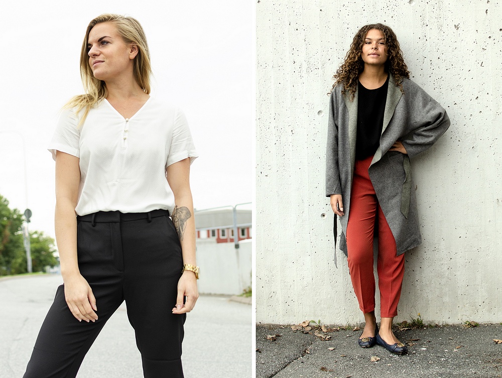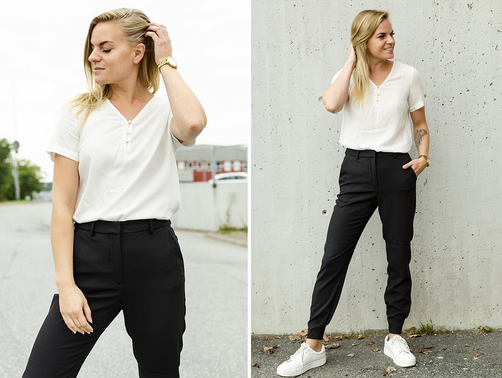 Jessica har på sig ett par helt fantastiska finbyxor från ICHI som vi verkligen rekommenderar! Dom är lite högre i midjan och har resår baktill samt resår i benslutet vilket ger byxorna coolt fall. Till byxorna har hon söta toppen från Vero Moda och som dessutom kommer i ljusblå och mörkblå.