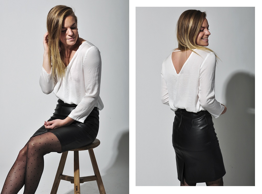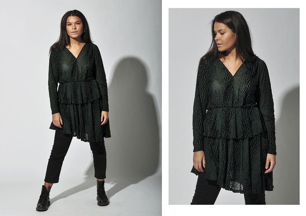 *Jessica har på sig den fina blusen som även kommer i svart. Strumpbyxorna är så fina och piggar upp vilken outfit som helst. Här har hon dessa i prickar, men de kommer även i leo och glitter.
