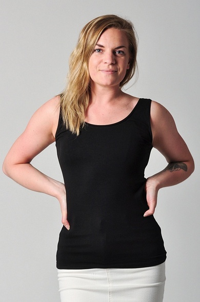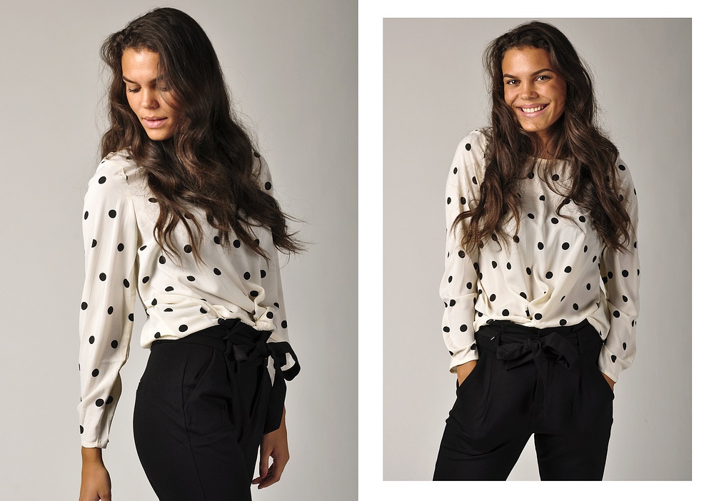Amanda har på sig en riktigt fin blus i lite blankare material. Den kommer i olika prickiga varianter och helsvart!