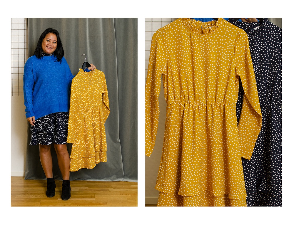 Nu har den fina klänningen som jag visade på bloggen kommit. Jag blev genast förälskad och norpade en. Idag är det lite kallare här så vad passade inte bättre än att matcha med dagens härliga stickade tröja. En trend vi kommer se mycket här framöver är att ha stickat till kjol eller över klänning. Perfekt för mig som är lite frusen, men ändå vill vara lite fin.
