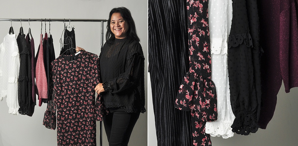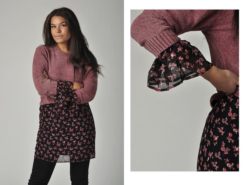 *Kajsa har matchat den fina klänningen i blommigt med jeans under och den goa tröjan som finns i tre olika färger. En perfekt kombo att ha på jobbet. Vill man bli lite festfin på 2 sek så ta av tröjan och byxorna och sätt på ett par klackar, och vips så är man redo för fest.