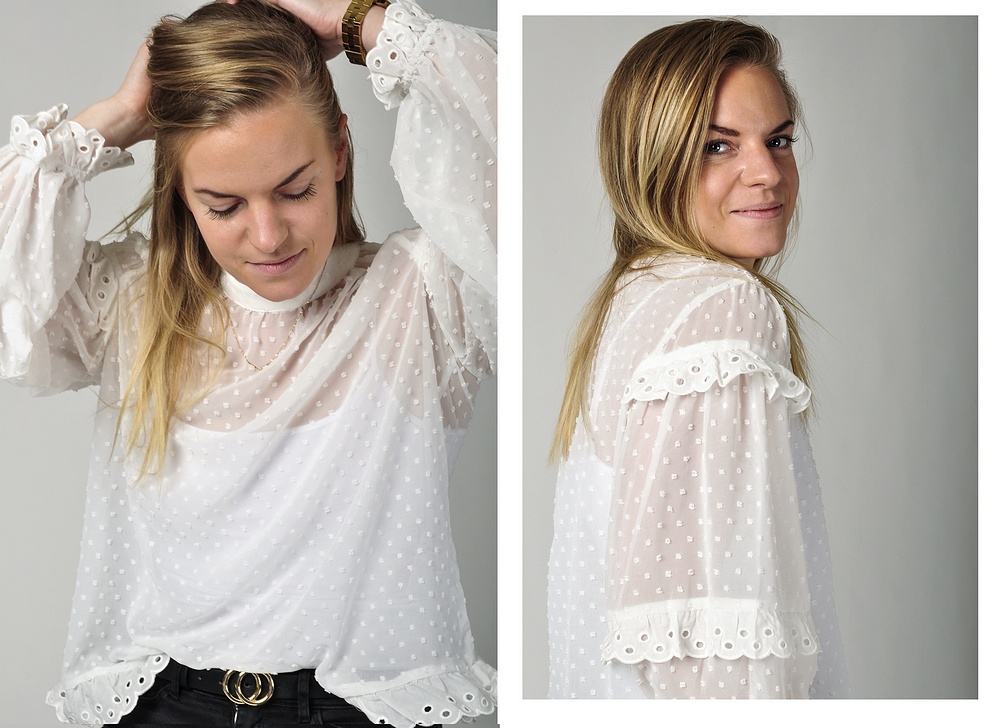 *Jessica har på sig supersöta blusen från Vila med fina volangdetaljer. Kommer även i svart.
