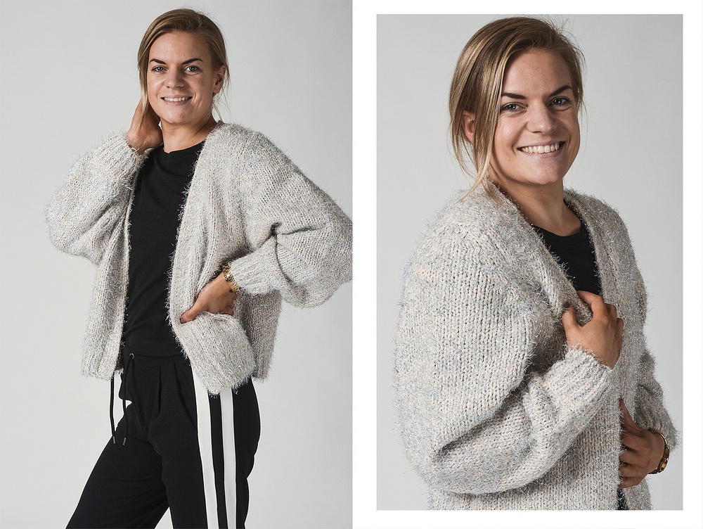 Jessica har på sig vår glittriga cardigan som kommer värma riktigt gott! Charlotte var snabb med att norpa den!