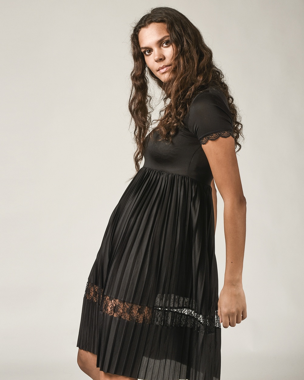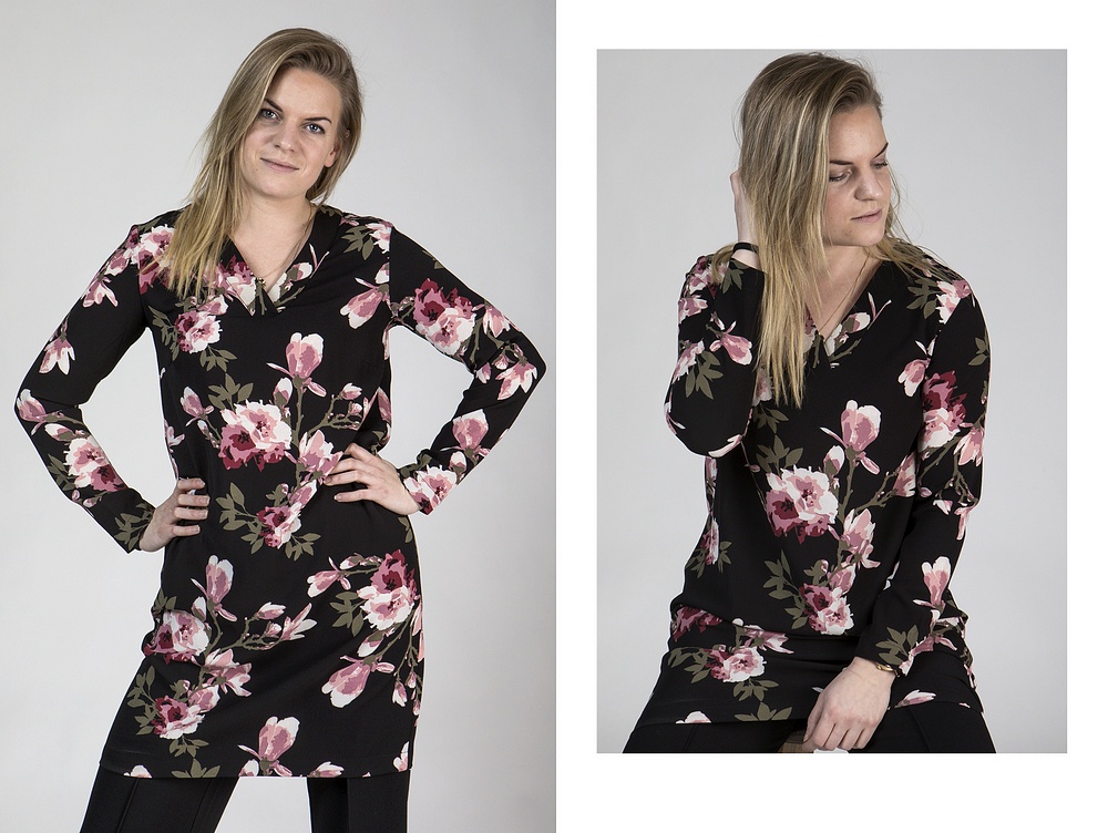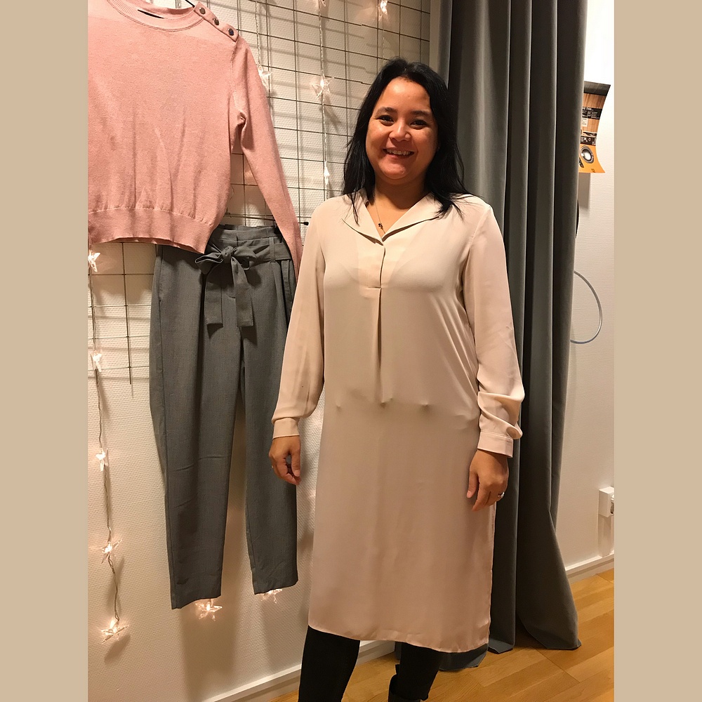 Ni ser Jessica i dagens fina klänning i rak härlig modell som är snygg att ha över dressade vida byxor som till jeans och strumpbyxor.
