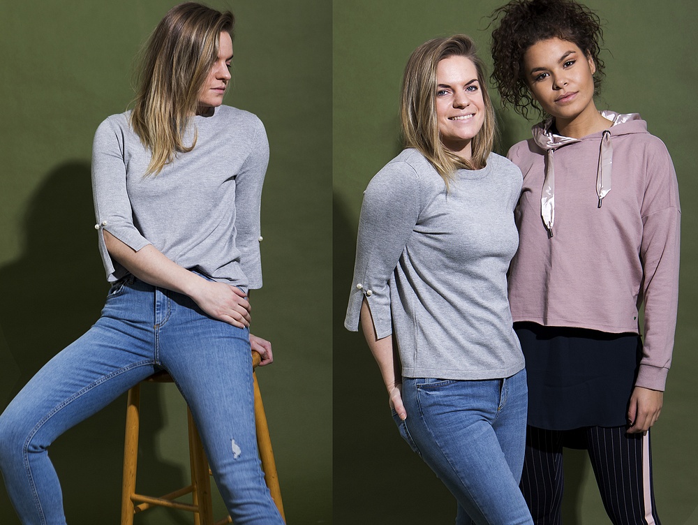 Kajsa har på sig coola collegetröjan med sidenband. Den här är lite bredare i modellen och lite kortare vilket är helt rätt nu. Supersnygg att ha både till vardagsoutfiten eller till och från träningen.