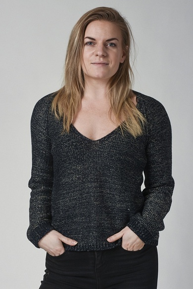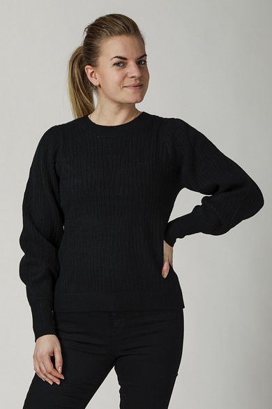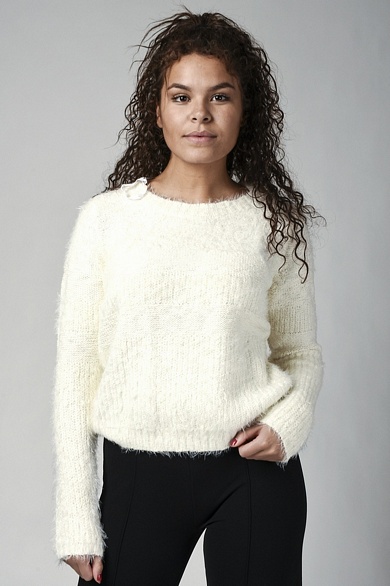 Jessica har på sig fina stilrena tröjan med pärldetaljer i ärmarna. Superfin och mjuk i kvalitén och lika fin att ha till vardags som till fest.