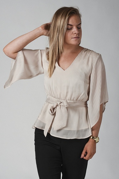 Dessa är så sköna i materialet, ordentligt tyg som är lite tjockare och i fin dressad modell med knyt i midjan. Till dagens har Kajsa vår fina topp "OBJMARI S/S TOP"