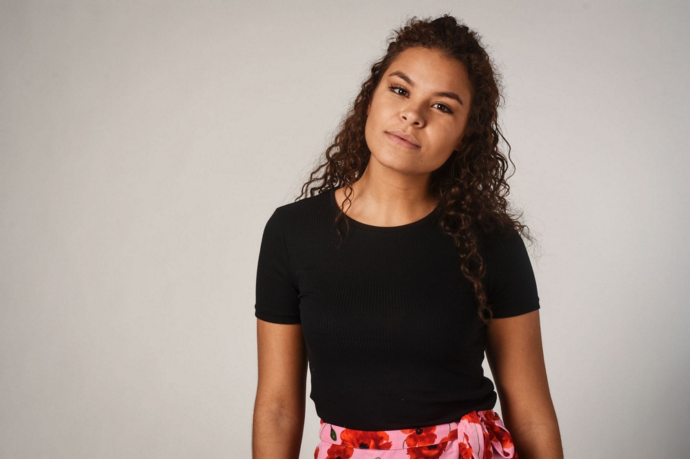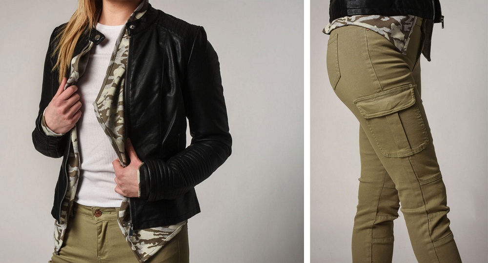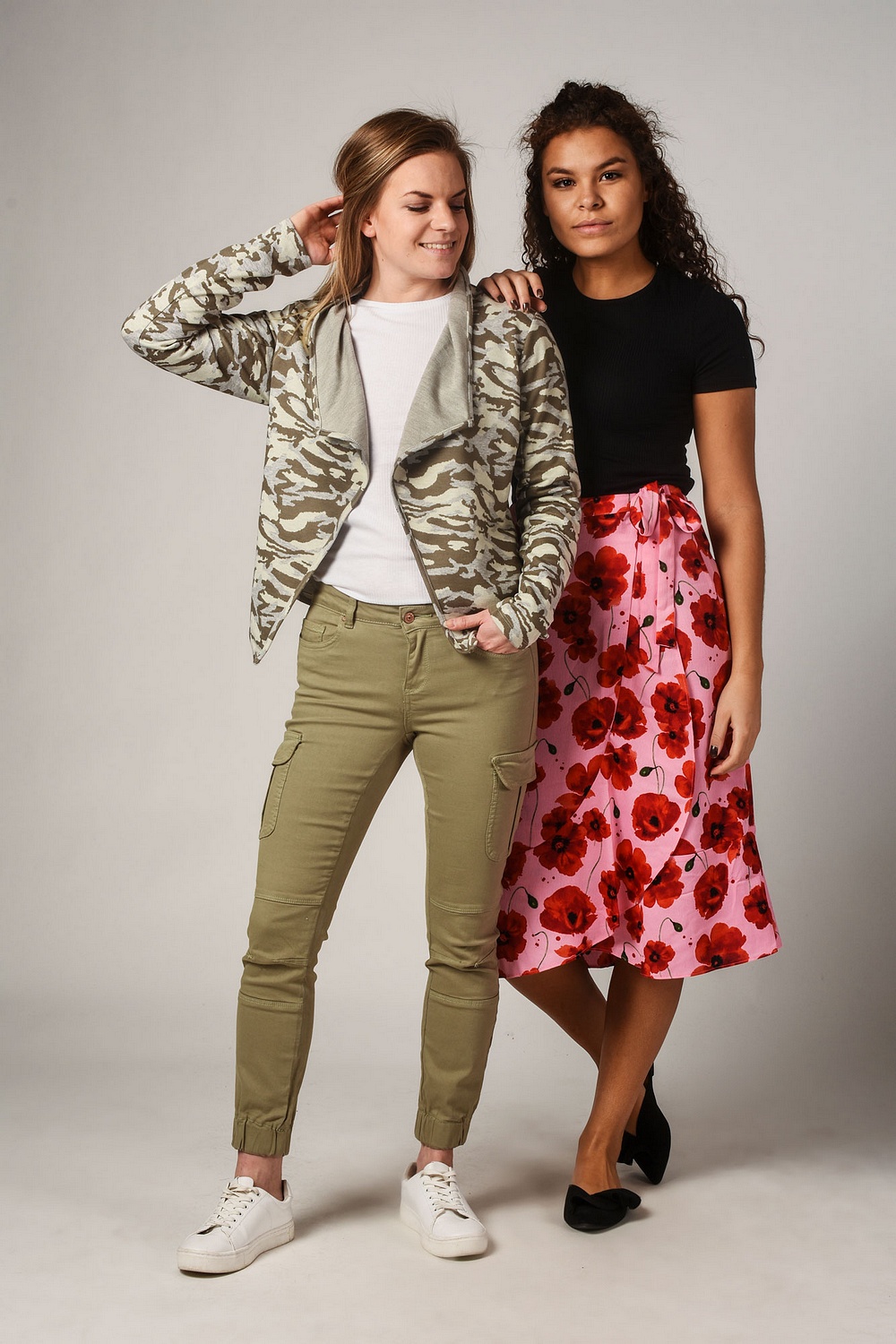 Jessica har på sig de snygga byxorna som hon matchat med den ribbade t-shirten tillsammans med camo cardigan från Soya.