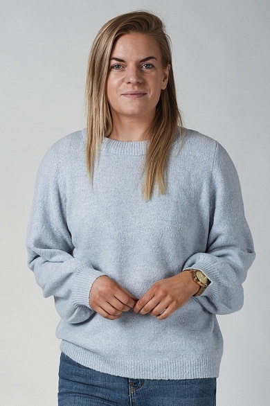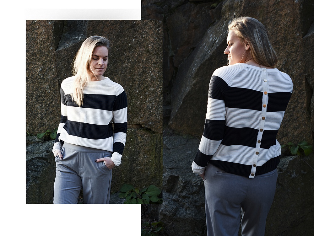Jessica har på sig dagens ribbstickade tröja som sitter så skönt och snyggt på. Den är fin att ha både som vardagströja och till finbyxor som ni ser här. Jättefina knappdetaljer i ryggen har den. Finbyxorna är våra storsäljare-finbyxor från object - objcecilie och kommer idag i färgen till synes, samt mörkblå och duvblå fräsch färg.