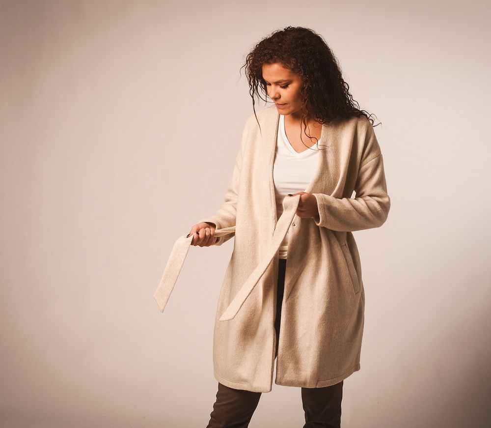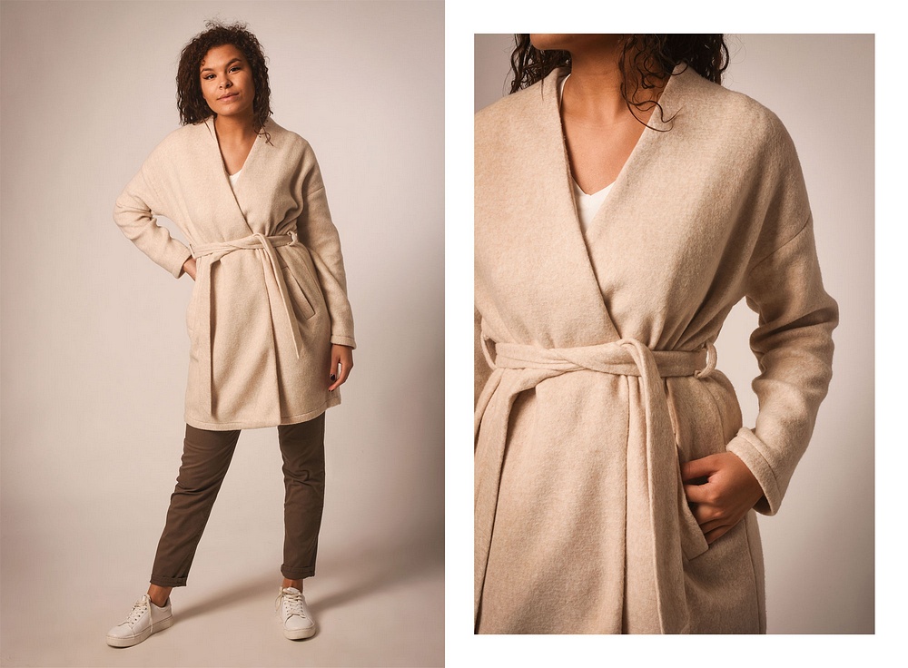 Kolla bara på Kajsas outfit! Hon har på sig ljuvliga coatigan/kappan i tunnare material som är så fin i både färg och tyg. Det kommer även ett par nya chinos idag som ni ser lite av här på Kajsa. Hon har här byxan i fin mullvadfärg, men den kommer även i mörkblå!