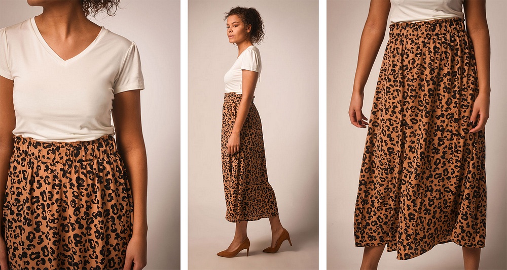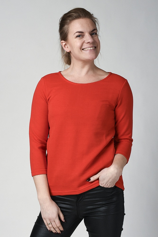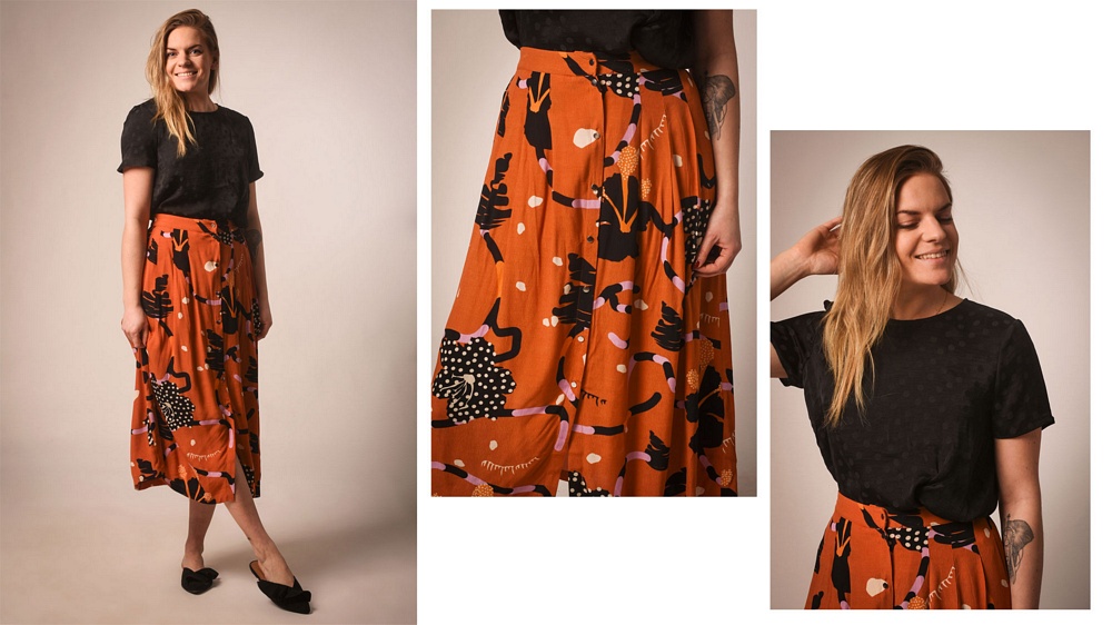 Men än har vi dagen på oss att leverera fina plagg till er.. ;) Sista nyheterna för den här veckan ser ni några av här ovan.. Kajsas fina kjol är så härlig och skön med resår upptill - bara att dra på och vips så är man snyggt och coolt klädd. Snyggt att ha bara till en enkel bas-tisha som kajsa har här. Den här t-shirten kommer även i svart och är i mjuk och skön lyocell och lite längre i modellen - den har även fina rynkdetaljer på axelpartiet.