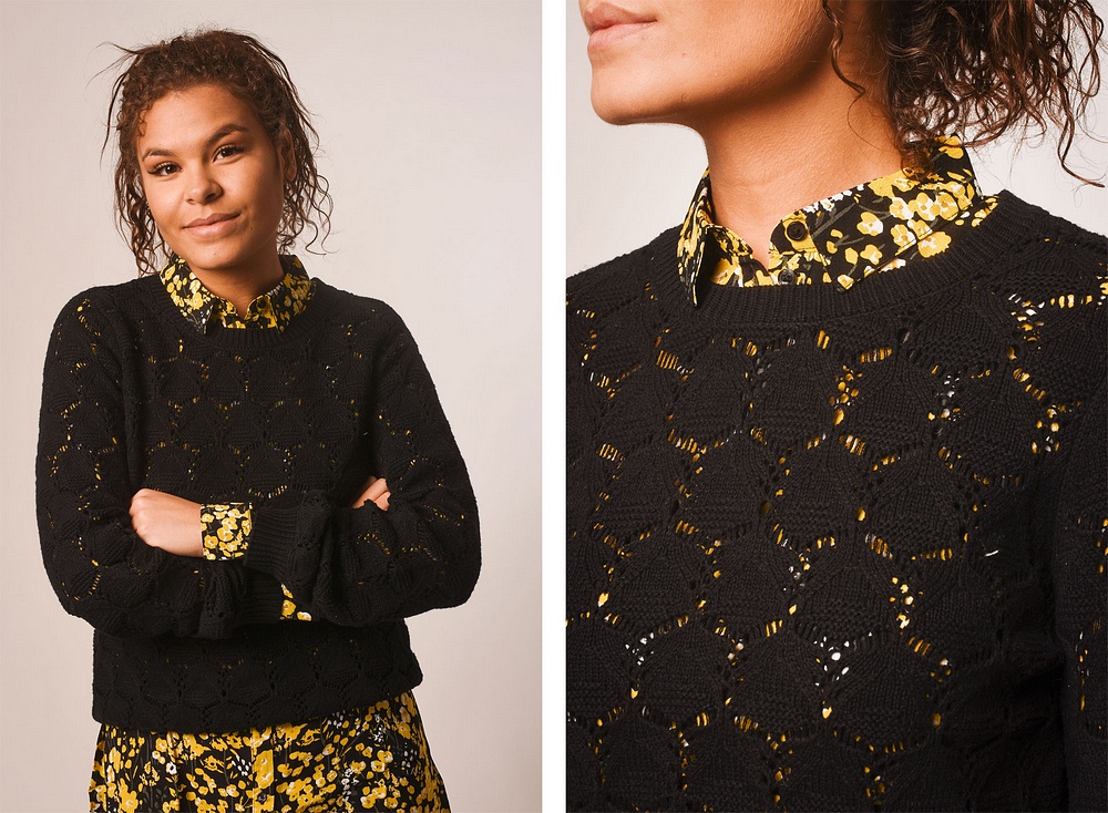 Kajsa har på sig ljuvliga och coola klänningen i svartgul. Den här har så fin feminin modell och långärmad vilket är så fint. Över har hon nya stickade tröjan, och även den här kommer i snygg gul färg som vi ser mycket av nu bland vårens nya färger!