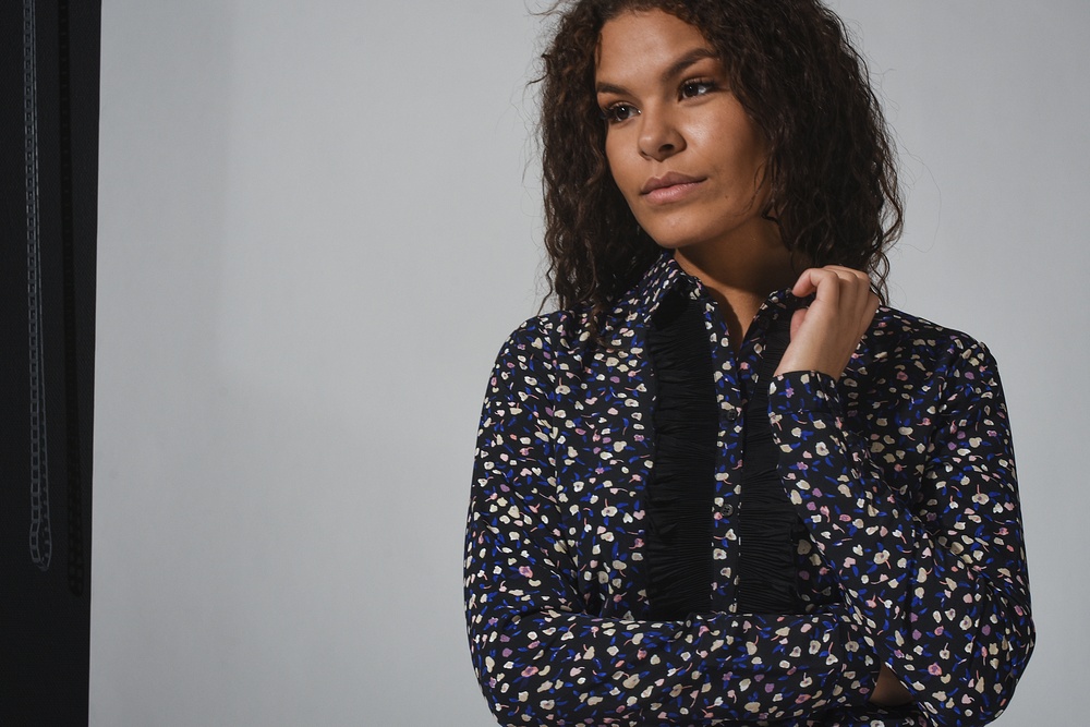 Jessica har på sig dagens fina blus som är rak och härlig i modellen. Fint blommönster med blå botten här men den kommer även i snygg gul botten. Snygg att matcha till både jeans, kjol eller finbyxorna!