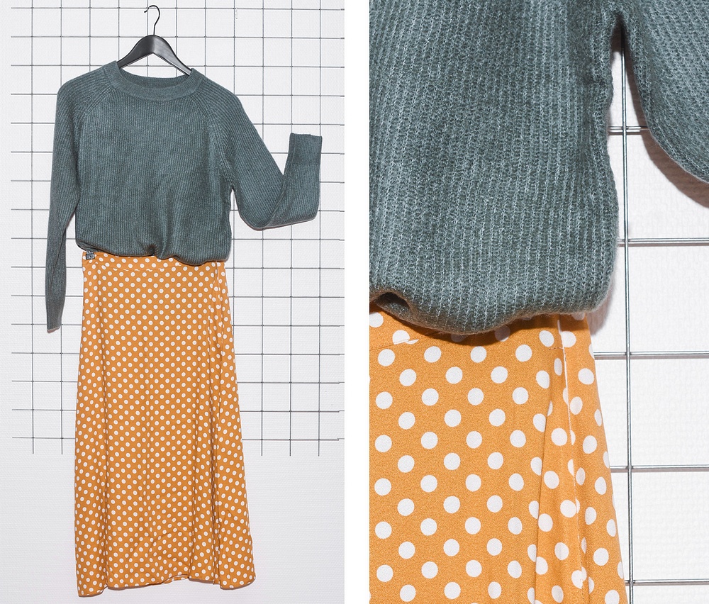 Gulprickiga kjolen objsigrid är i lite längre modell och i fin modell som faller snyggt.