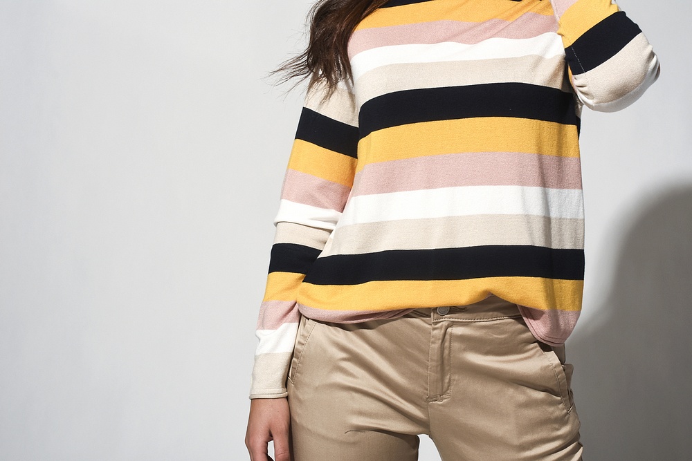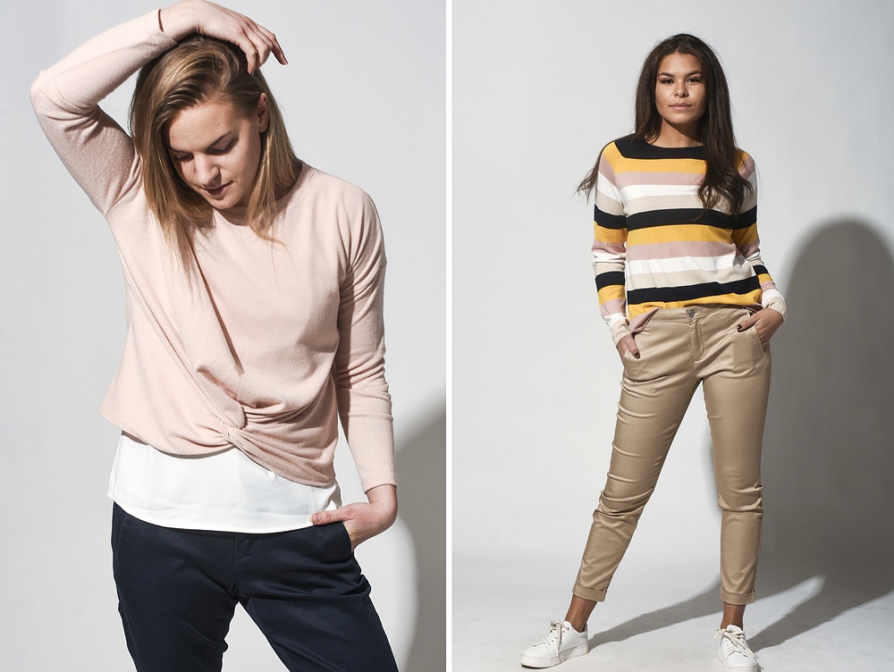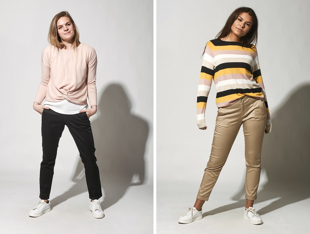 Kajsa har på sig chinosen i sandfärg, superfräscht tillsammans med dagens nya randiga tröja som kommer i två olika utföranden.