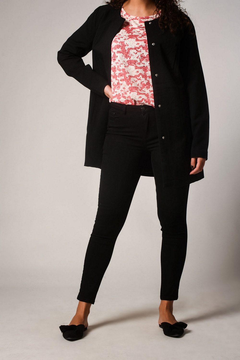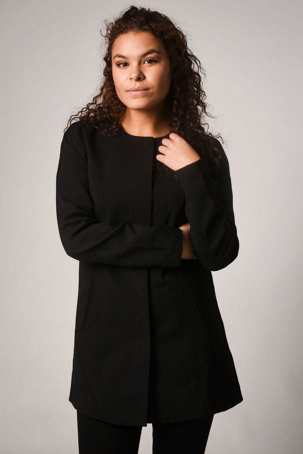 Kajsa har på sig dagens sköna jeans och kappa i svart som blir stilrent och fräscht.