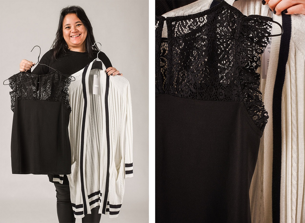 Till det har hon dagens härliga topp med spets upptill och den här kommer i fyra fantastiska färger och kostar bara 199 kr. Mjuk och fin kvalité.