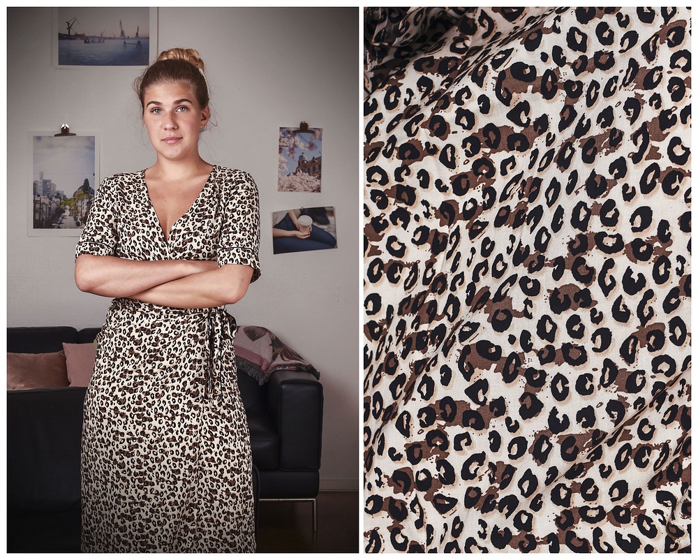 Här ser ni fina Ida i vår nya leoklänning.. här i brunt men den kommer även i riktigt snygg lila ton. Fin omlott-modell med v-ringning och i mjukt fint tyg.