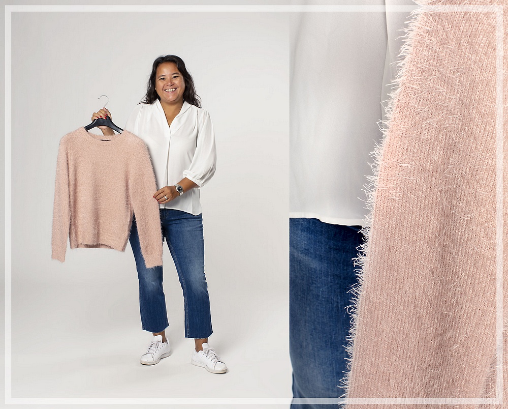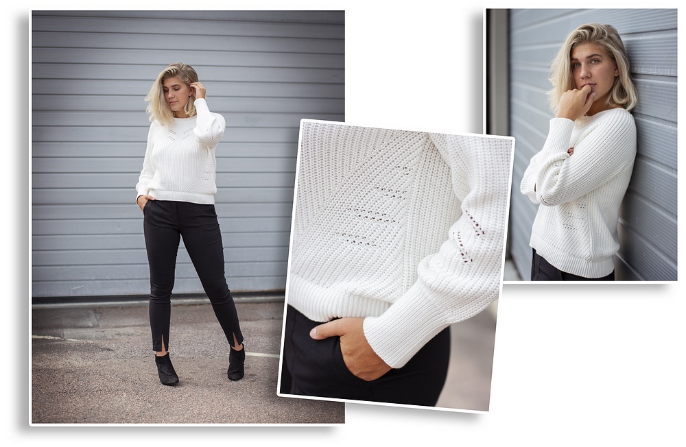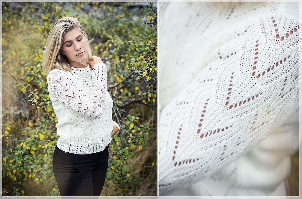 Här ser ni den andra fina tröjan som kommer idag. Lite tunnare stickad med fina hålmönster. Perfekt att ha nu i mellanperioden. Även snygg att ha över klänningen eller till jeans som Ida har på bilden.