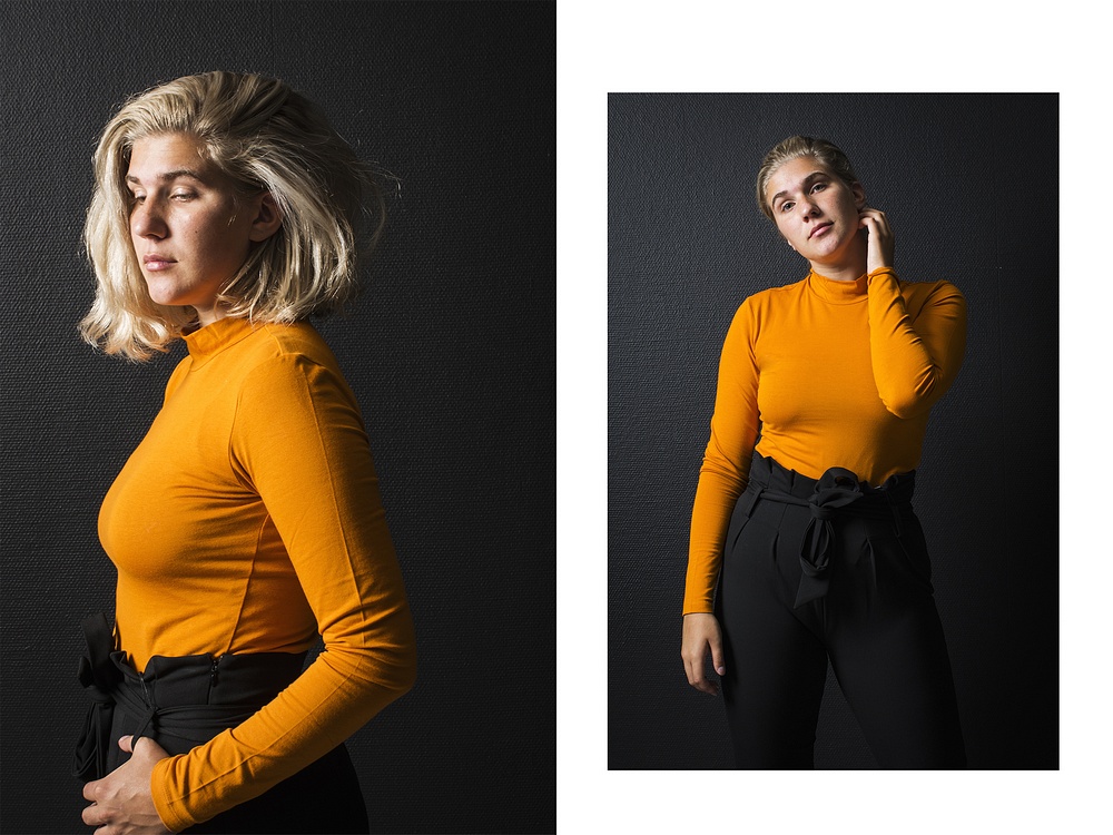 Ida har på sig sköna tröjan med turtleneck Jdyava, som vi har haft inne i svart. Den kommer nu i denna oranga fina nyans samt grön och roströd. Byxan är high waist och kommer från Object. Det kommer även en finstickad polo från Vila och ett par supersnygga coatade byxor från Vero Moda.