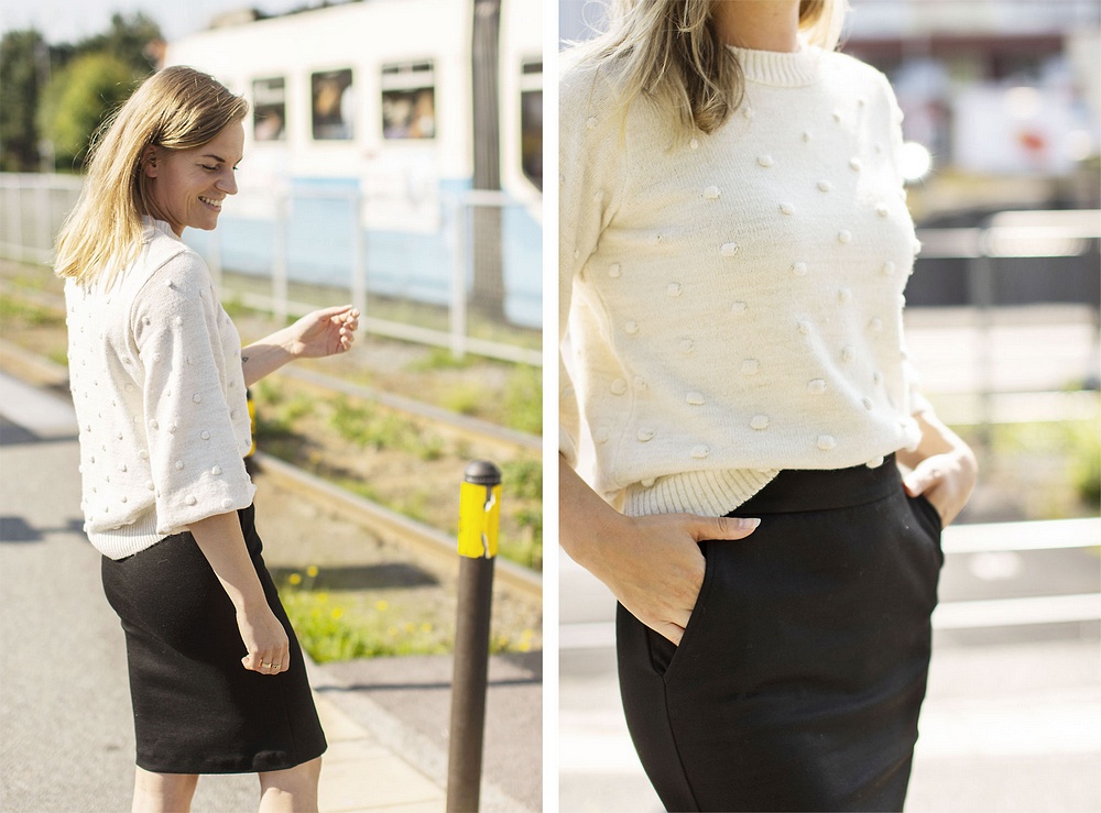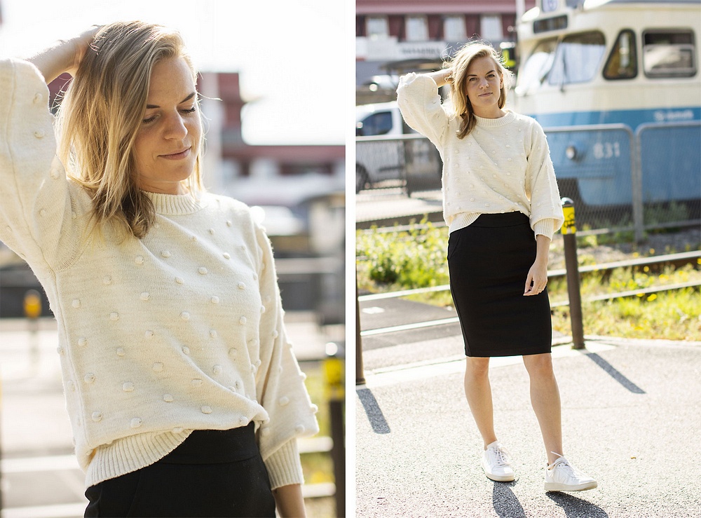 Idag kommer den här stickade tröjan med små söta stickade bollar på. Mjuk och skön kvalité och i en modell som passar till allt. (Camilla norpade den direkt från ställningen) Superfin att ha till kjol som jag har här.. det är en ny kjol från Soya Concept som den kommer även i grå fin färg. Dessutom kommer en ny färg på vmava-tischan och sist men inte minst kommer det ett par plisserade byxor som är heeelt fantastiska. Byxan kommer i två färger - en helblå och en blå/röd-randig som matchar den nya tischan såå snyggt =)