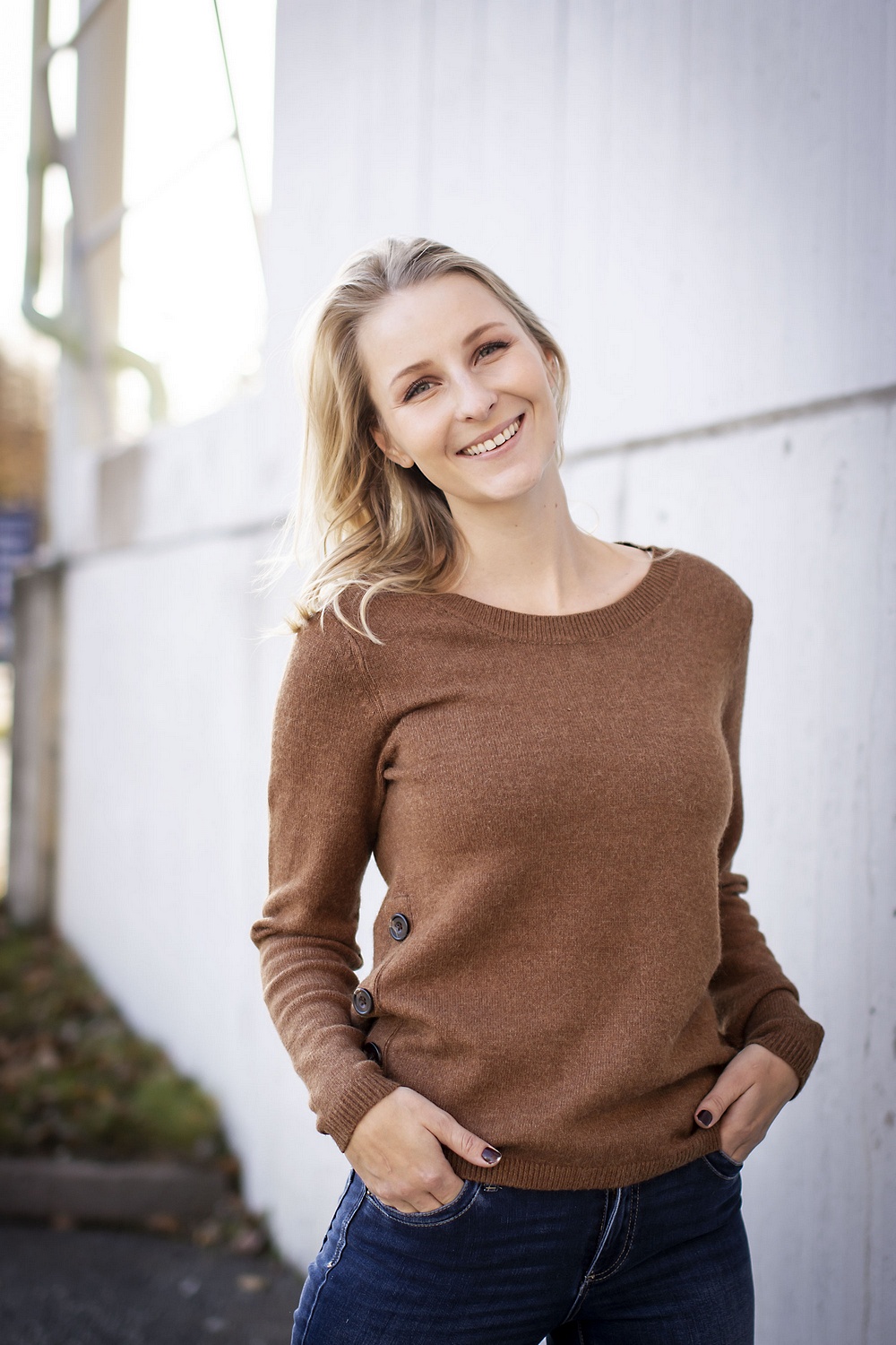Jag älskar stickade tröjan som Maria bär här i brunt. Den är så enkel och stilren men har ändå lite fina detaljer i sidan med de stora knapparna. Den här kommer även i snygg vit.