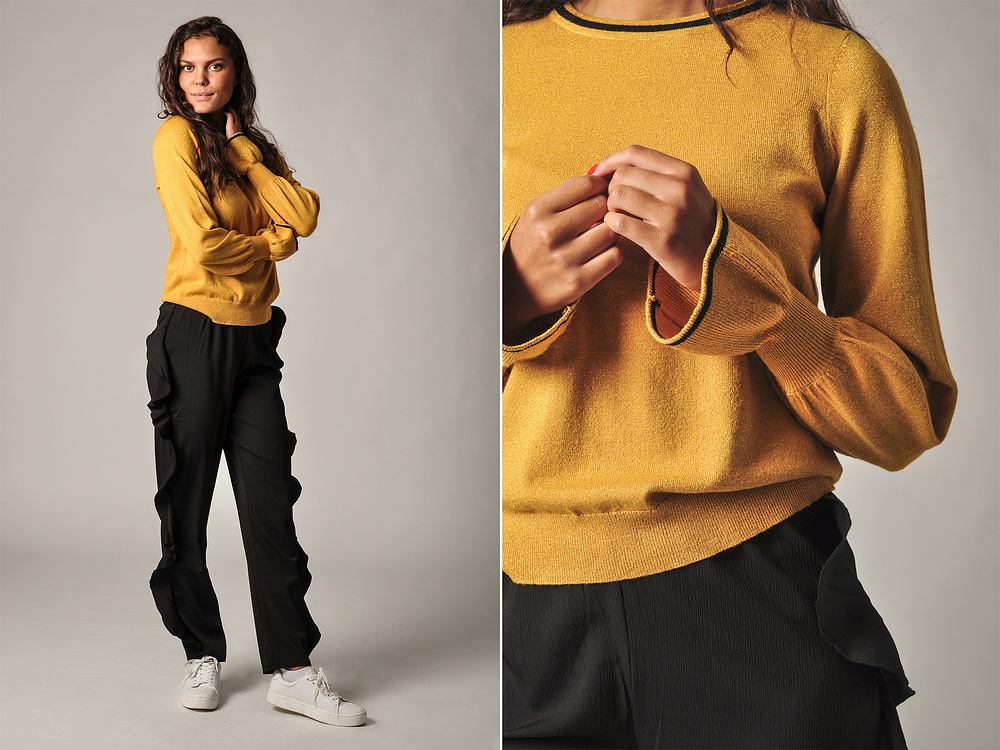 Den gula toppen är riktigt trendig med lurex och volangdetaljer och det ser vi mycket i alla kollektioner från flera varumärken där ute :)